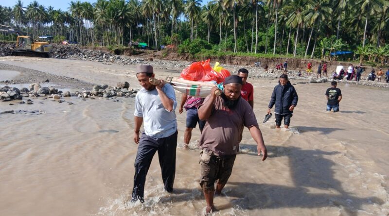 Menariknya, proses penyaluran bantuan tidak berjalan mudah. Tim penyalur harus menyeberangi Sungai Ake Aru di Desa Bobisingo dengan arus yang masih deras, menyusul jembatan penghubung yang putus akibat banjir, dampak cuaca ekstrem dan curah hujan tinggi di wilayah tersebut.